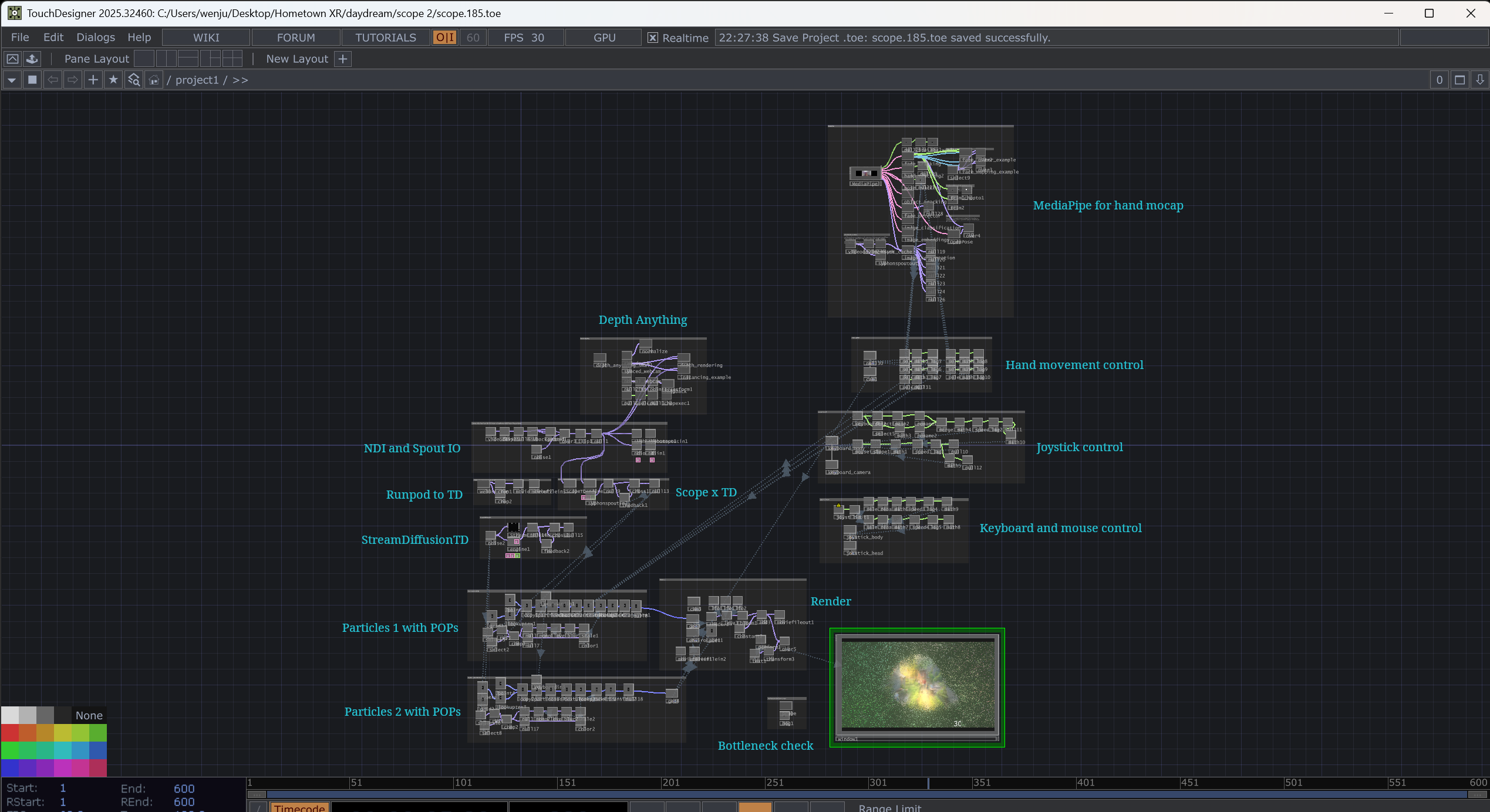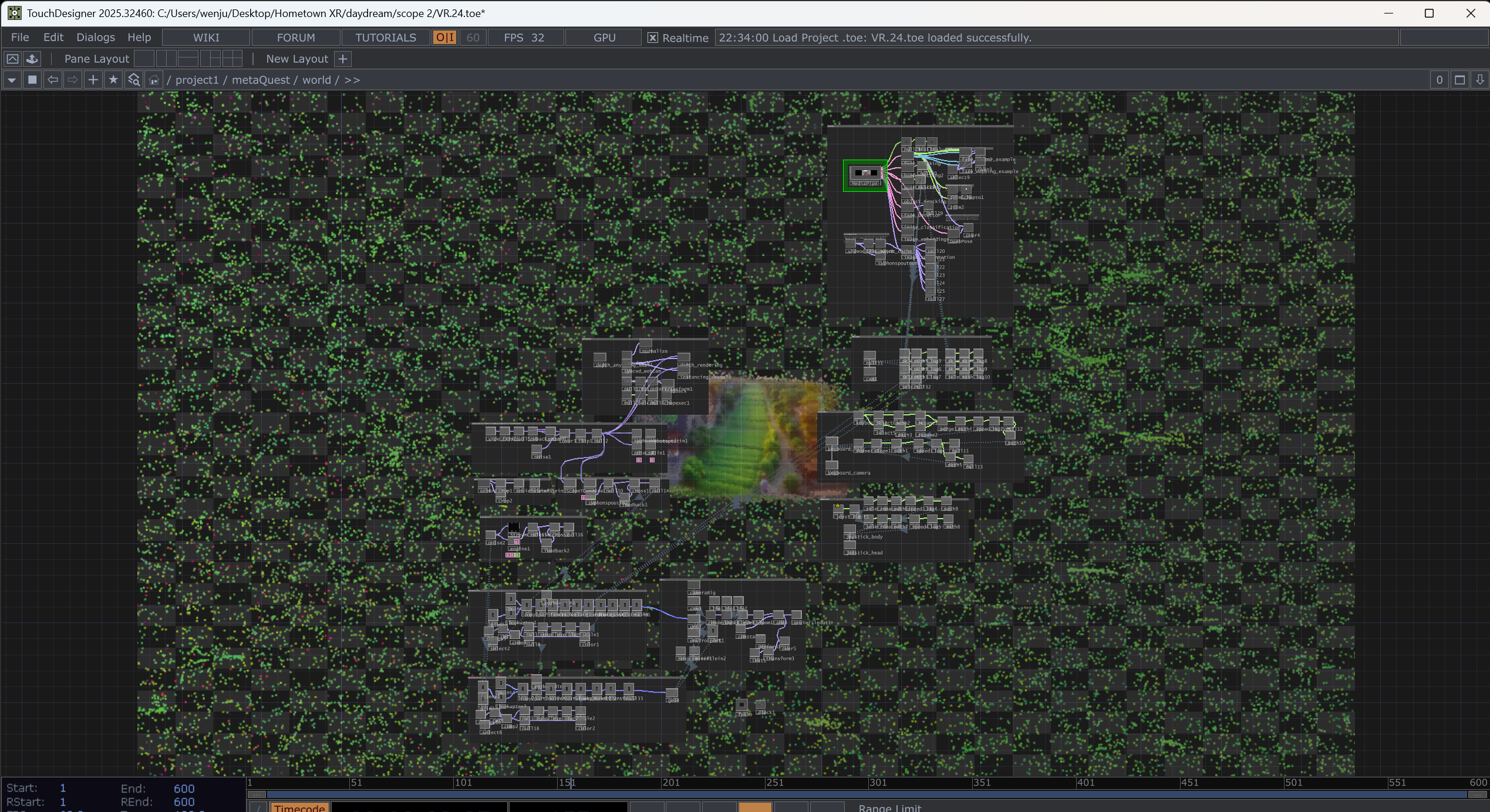 A continuation from the previous progress: https://app.daydream.live/creators/wenjun/hometown-xr-ongoing-with-scope , my plan for this AI video program would be to focus on particle movement control with gesture/body movement (with mediapipe?) and VR display built on TD as a kind of virtual installation.