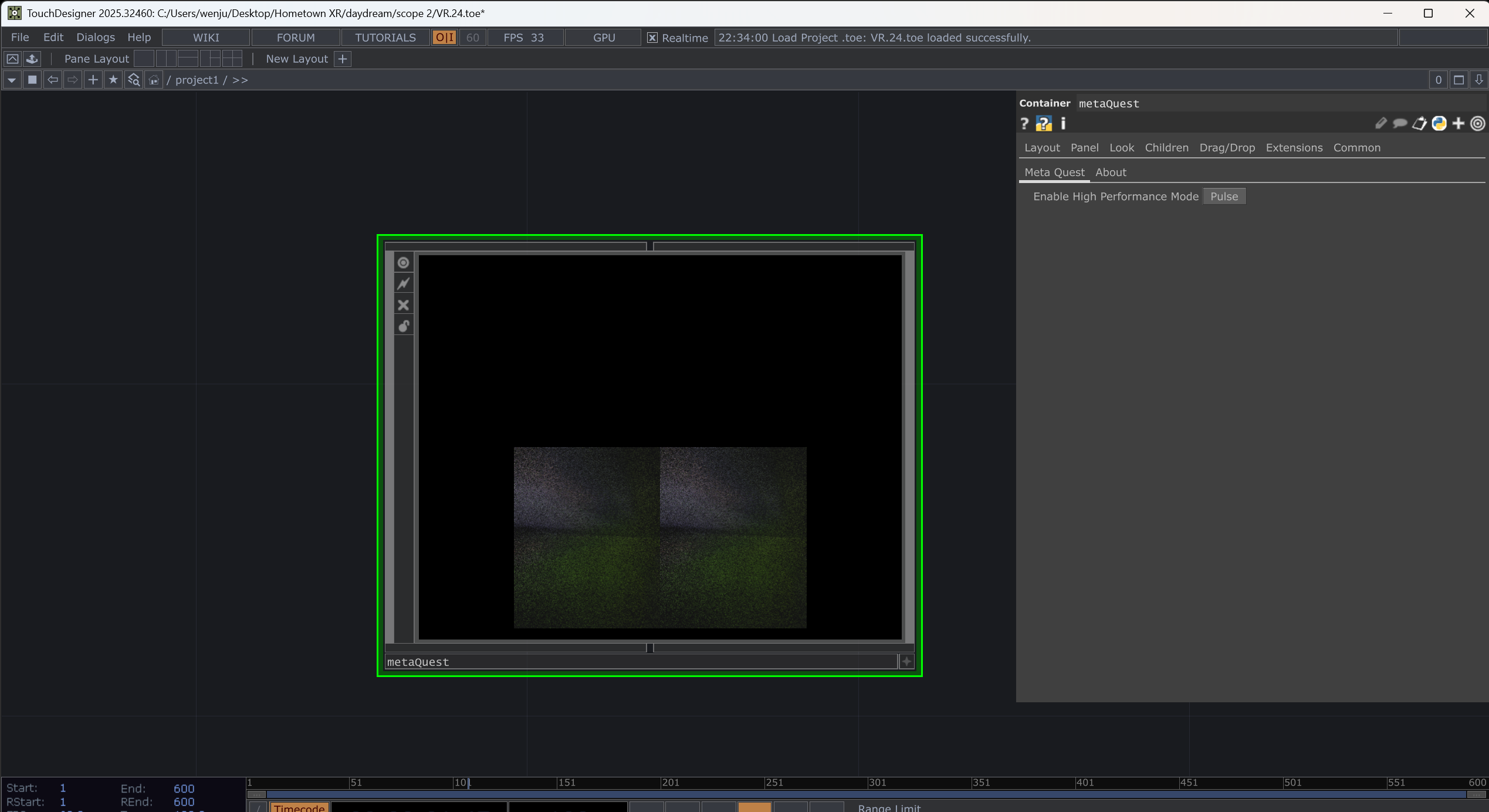 Previously, I tried to feed the particles from TD to Unreal Engine. Though the process is not so difficult, UE is also good for dealing with 3D productions. I found it was too heavy for my 3080 Ti to have two particle systems, both on TD and UE simultaneously. So this time, I tried to build the VR directly in TD. Actually, it is ok easy. There is a MetaQuest component in the Palette. Basiclly what I need to do is to swap the 3D environment in the template to my particle system. But I still need to experiment with the camera position. Now I have the one which is not what I supposed.