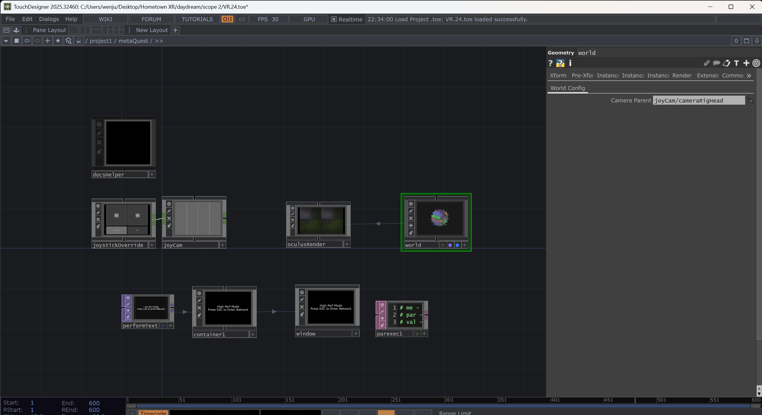 To run the TD VR in an Oculus headset. I need to run the Link connection in the headset first, then run the TD VR toe file. Then everything will run automatically. Welcome to the VR world. But I still need to experiment with the VR joystick control. Now I use another video game joystick to control the particles.
