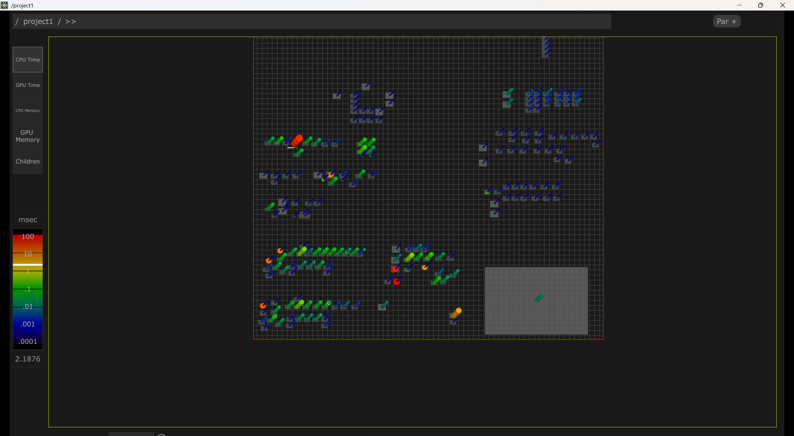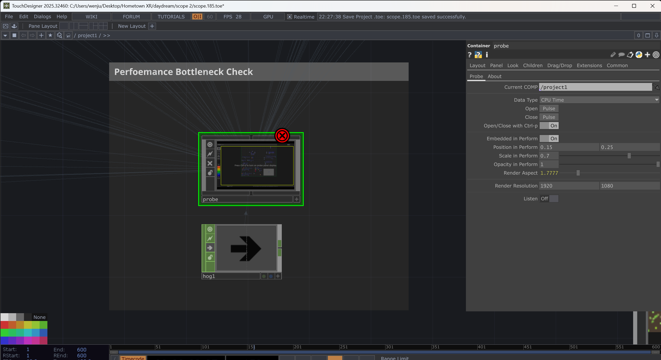 The probe component can let me see which guy is running heavily. And Hog CHOP adds a heavy CPU load instantly, so I can detect whether the bottleneck is on the CPU or the GPU...